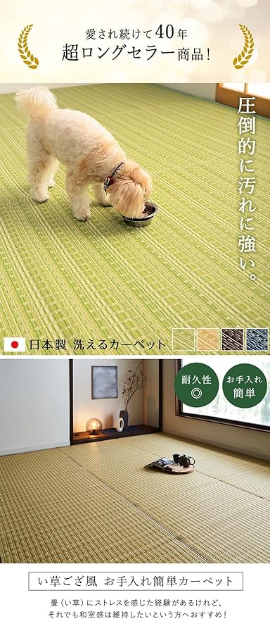 強度が高くしっかりとしています。 汚れても水洗いができるので、いつでも清潔にお使い頂けます。 カビが発生しない素材なので、カビを食するダニなども寄り付きにくいです。 一般的な除菌スプレーで拭いても色落ちせず、常に清潔な状態を保つことができます。 繊維が毛羽立つことが無く、埃が出にくく、日頃のお掃除が楽になります。 リビング、ダイニング、お子様のお部屋、など様々なシーンで活躍します。 ※ 畳のお部屋に上敷きとして使用する場合は市販の上敷き鋲との併用をおすすめします。 ※ 滑りやすい床等で使用する場合は市販の滑り止めシートとの併用をおすすめします。 ※ 掲載写真は表記サイズと異なる場合がございます。 ※ 画面上のカラーはご使用ブラウザやモニターの設定により、実物とは若干異なる場合がございます。あらかじめご了承の上、ご注文をお願いいたします。