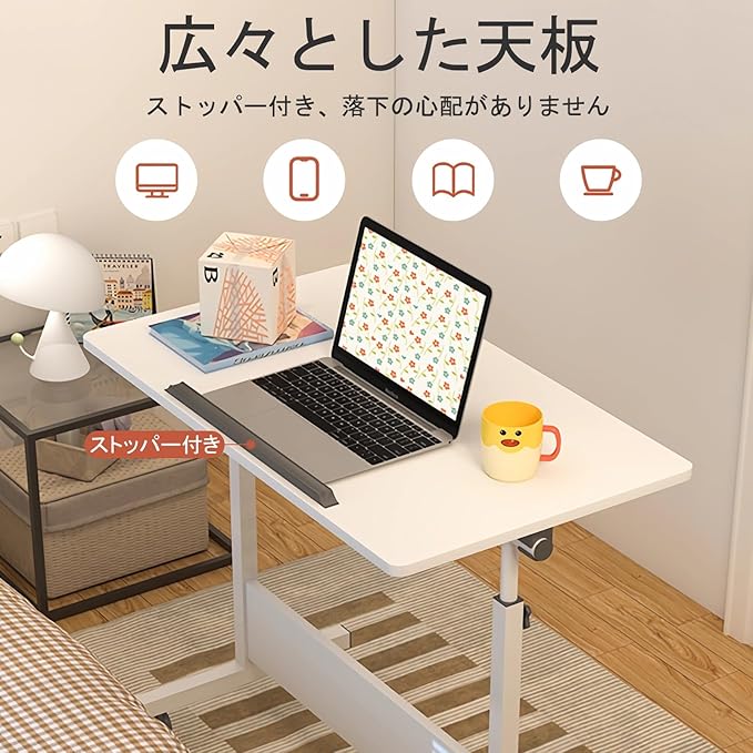 天板角度調整可能:360 幅広い傾く範囲無段階調整可能、使いやすい角度でお使いいただけます。天板を傾けた時にノートパソコンやタブレット、雑誌などが落ちないようにストッパーが付いています。使用しない時は天板を折り畳みむことで圧迫感がなく収納しておけます。