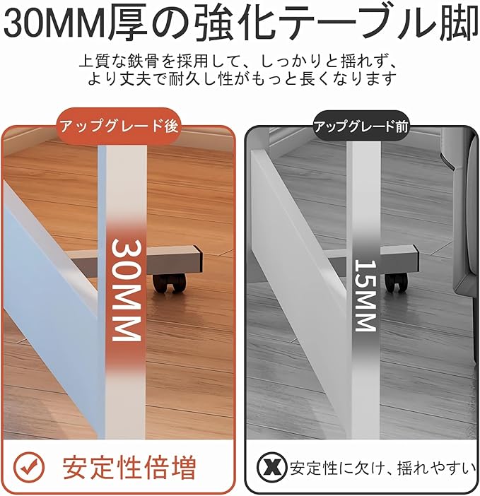 T形フレームで安定感ある:末広がりで太さのある脚が天板に接して、Tの字型のテーバードデザインに仕上げまして、耐荷重は50kgとなり、パソコンや周辺機器などデスクワークに必要なものをたっぷり載せられます。Tの字型デザインで、ソファやベッドの足元に差し込んで、テーブルが手元近くてお使い便利。両脚の間に固定板を設置して、机の安定性をアップすると共に脚置きにもなり、更に快適な在宅ワークが出来ます。