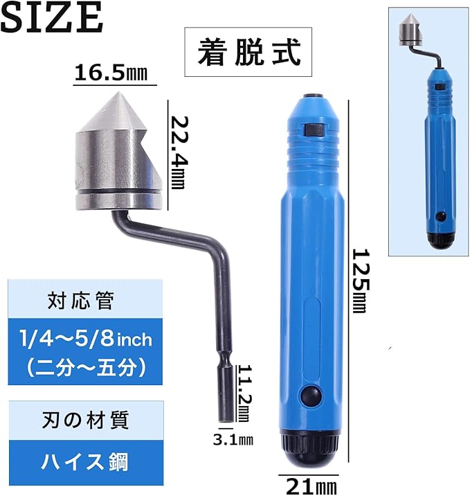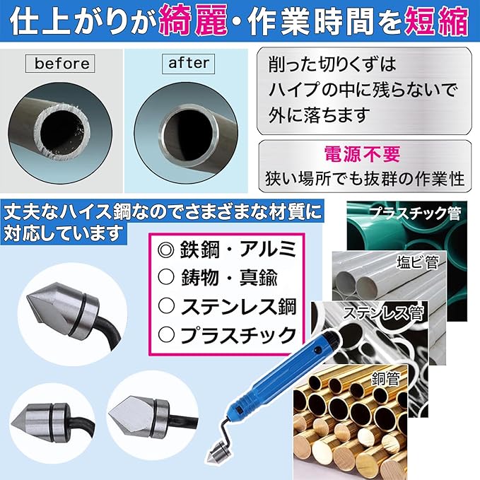 【作業時間を大幅に短縮】 面倒な手作業も、クルクルと回すだけで短時間で完了。時間をかけての面取り作業が不要になり、作業効率が格段に向上します。工具セットに1本あるだけで、現場でのバリ取りが驚くほどスムーズになります。