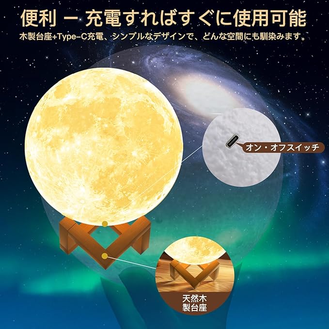 高級感ある木製スタンドと完璧なギフト:シンプルで洗練されたデザインの木製スタンドが、月ライトに自然な温かみを加えます。この月ライトは単なる照明器具ではなく、インテリアの一部としても非常に魅力的です。誕生日や記念日、特別な贈り物に最適で、きっと大切な人に驚きと喜びをもたらすギフトとなります。
