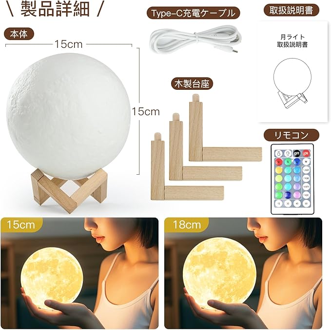月ライト【新升级モデル】リモコン付き 間接照明としても使える人気アイテム 3Dプリント技術採用 USB充電式 軽く叩いて調光 16色切替 木製スタンド付き おしゃれなインテリアや節句・プレゼントに最適(直径15cm)