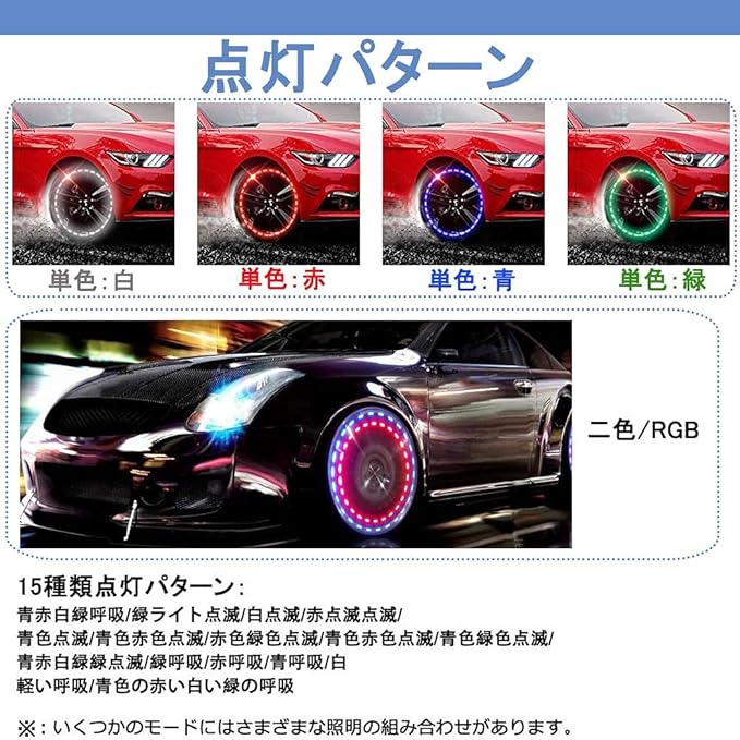 KYOUDEN 車用 ソーラーホイールランプ タイヤホイールライト LEDタイヤガスノズルキャップランプ 15種類点灯パターン 防水 簡単取付 4個セット