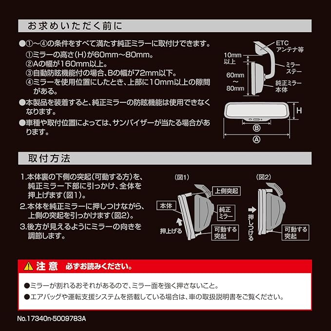 ●純正ミラーサイズにより、取付出来ない場合がございます。詳しくは取扱説明書をご確認ください●本製品を装着すると、純正ミラーの防眩機能は使用できなくなります●エアバックや運転支援システムを搭載している場合は、車の取扱説明書をご覧ください