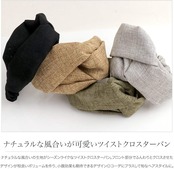 ナチュラルな風合いの生地がシーズンライクなツイストクロスターバン。フロント部分でふんわりとクロスさせたデザインが程良いボリュームを作り、小顔効果も期待できるデザイン◎コーデにプラスして旬なヘアスタイルに。
