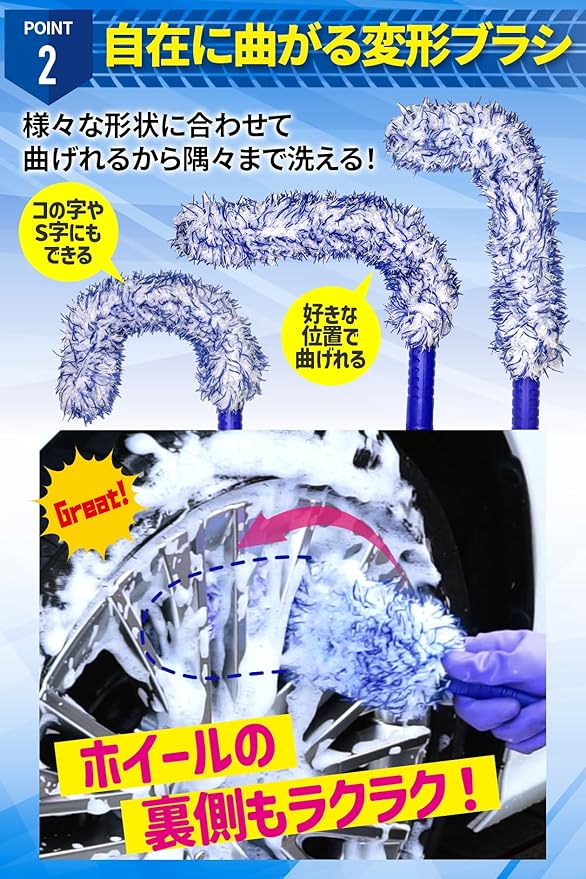 【自在に曲げられて洗いやすい】通常のブラシでは届きにくいホイールの奥深くまでしっかり洗浄できるよう、平らで長めのブラシデザインに仕上げました。ブラシ本体は曲げられるのでホイールの裏側も簡単に掃除できます。