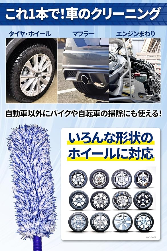 【洗車ブラシとしてマルチに活躍】タイヤ周りのホイールやスポークだけでなく、車体やドアフレームなど洗車にもおすすめです。細かい隙間まで入り込んで徹底的に汚れを落とします。