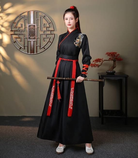 【こだわりのデザイン】肩にドラゴンの刺繍が舞う気合いの入った一着。ありそうでなかった上下ブラックカラーです。幅広いサイズ展開で大きいサイズをお求めの方、レディースやメンズ漢服をお探しの方におすすめです。紐での調節となりますので、どんな体型の方でもお楽しみいただけます。お友達や男女お揃いでの着用も可能です!