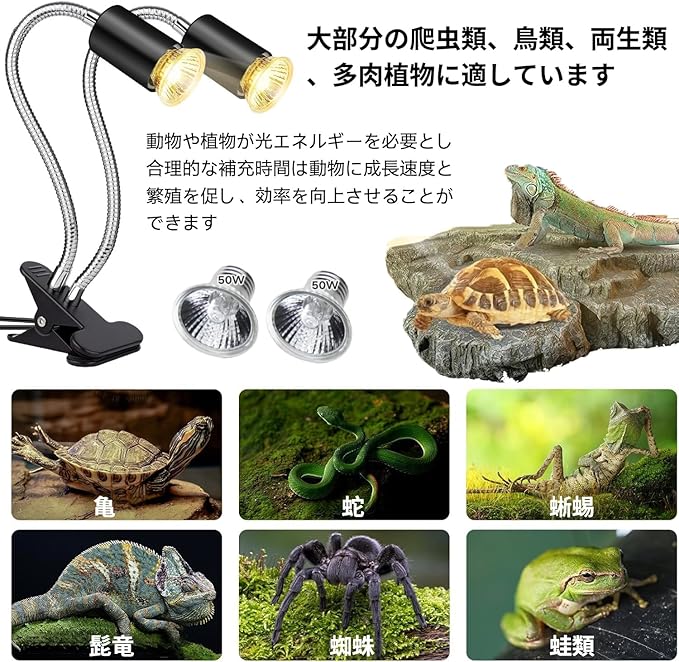 シミュレートされた日光浴ライト: 動物の食欲を増進し、爬虫類の自然な成長の環境の必要性を満たす2 x 50Wの球根は太陽模倣する2つの球根を提供する