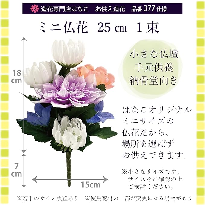 小さな仏壇、手元供養、納骨壇ぴったりのミニ仏花です。 造花専門店はなこオリジナルのミニサイズ造花仏花(高さ25cm)は、スペースを取らずに、お手入れ不要で、いつまでも枯れないお供え花です。 お仏壇・納骨堂・手元供養・ペット供養・法事・お彼岸・お盆・命日などに、静かな祈りの空間を彩る、小さくてかわいらしい仏花です。 国内スタッフが検品をして出品いたします。