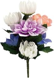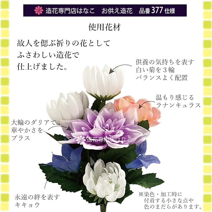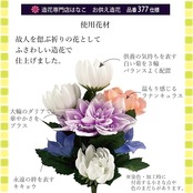 ・商品名 ミニ仏花(造花) ・品番 377 ・サイズ 高さ:約25cm(花部18cm/茎部7cm)、幅:約15cm ・使用花材 菊(白)、ダリア(紫)、ラナンキュラス(ピンク)、キキョウ (青) ・用途 仏壇、納骨堂、手元供養、ペット供養、命日、法事、お彼岸、お盆など ・特徴 水やり不要・枯れない・コンパクトサイズ ・注意事項 小さいサイズです。サイズをご確認の上ご検討下さい。造花には染色や加工による小さな点・色むらのある場合があります。