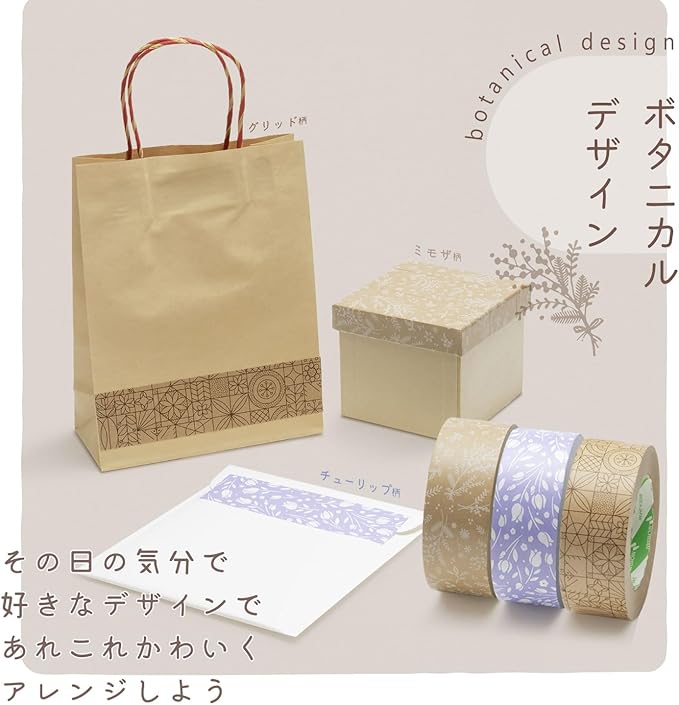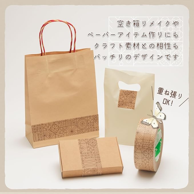 【柄入りクラフトテープ】クラフト素材に上品なデザインが入ったお洒落なテープ。強粘着でしっかり梱包も可能