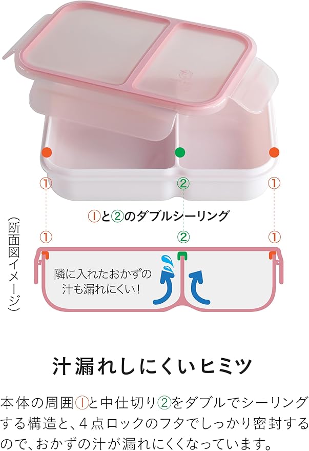 一体型のパッキンと4点ロックで汁漏れを防止します!本体の周囲と中仕切りをシーリングするWシーリング構造。お弁当内での汁移りも防ぐので、おかずなどの味移りも防止します。※本商品は密閉容器ではありませんので、水分の多い物や汁物は入れないでください。漏れの原因になります。
