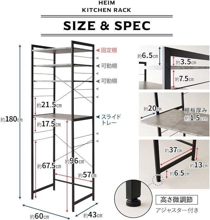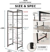 【サイズ】 約幅60 奥行43 高さ180cm/棚板(固定棚):約幅57 奥行43 厚さ1.5cm/棚板(可動棚2枚):約幅57 奥行37 厚さ1.5cm/棚板(スライドトレー):約幅55 奥行43 厚さ1.5cm 【組成】 フレーム:スチール(紛体塗装) 棚板:合成樹脂化粧繊維板(メラミン) 【カラー】ブラック 【耐荷重】 固定棚:約15kg(棚板1枚当たり) 可動棚/約15kg(棚板1枚当たり) スライドトレー:約10kg 【組立所要時間】 約15~30分