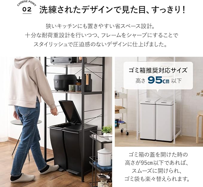 選ばれる4つのポイント Point.1 ゴミ箱の上の空間を有効活用 一番下のスペースには、上開きのゴミ箱も置けます。 同じHEIMシリーズの電動ゴミ箱なら、デザインも統一でき、臭い漏れも抑えられるのでオススメです。 Point.2 高さが変えられる可動棚(2枚) フックに引っ掛けるだけのカンタン可動棚を2枚セット。 電子レンジ、オーブントースター、炊飯器やコーヒーHOTなど、様々な家電サイズに対応。