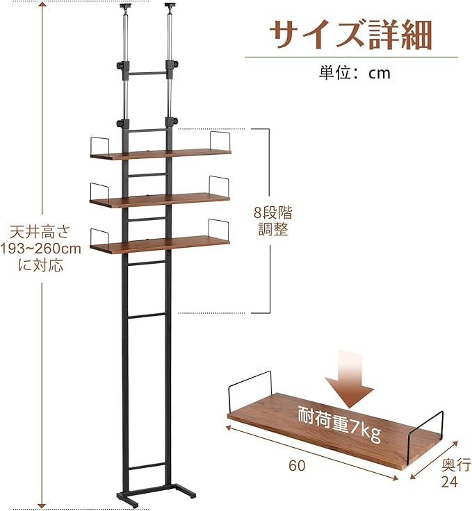 【商品仕様】本体サイズ:幅60 奥行26 高さ193~260cm(※アジャスターを含む)。 重量:約10.4kg。耐荷重:棚板1枚あたり7kg。材質/[フレーム]スチール、[棚板]メラミン化粧板。日本語組立説明書付き。