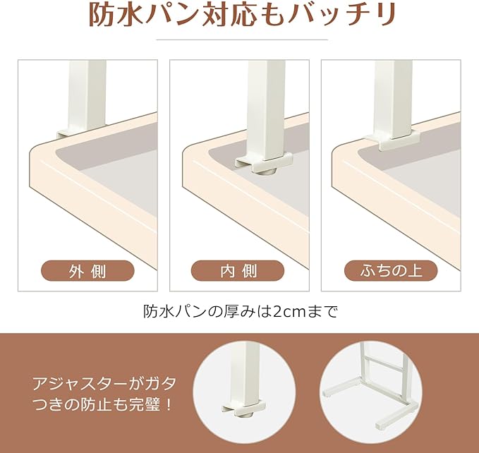 【頼れる防水パン対応】ガタつき防止のアジャスターが付属し、取り外すと防水パン対応の脚先にもなれる。新開発の”コ”字型脚先は従来品より安定感が大幅UP!付けても外しても、どんな場合にも対応可能。