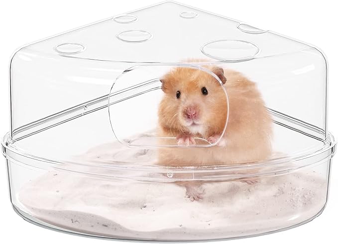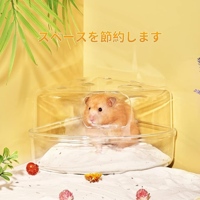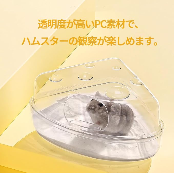 【かわいいチーズのデザイン】三角形のチーズのデザインのトイレで、かわいく面白くしてくれます。全面クリアのトイレで、浴び砂の上を気持ちよさそうに転がるハムスターを心ゆくまで眺めることができます。