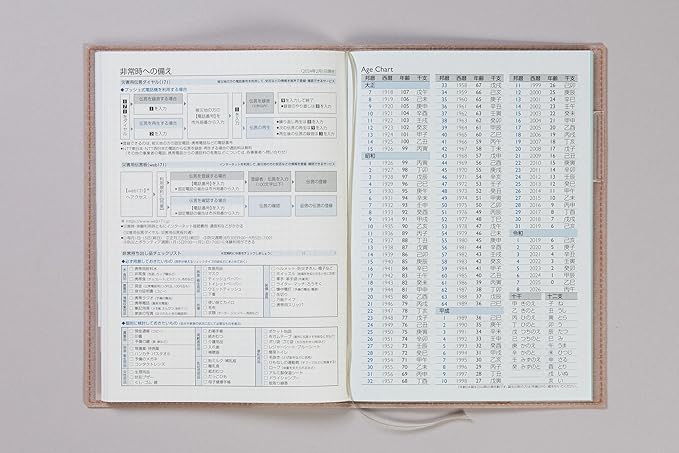 【商品詳細2】表紙タイプ:皮革調 ●刷色:3色刷 ●ページ数:128頁 ●スペック:ペンホルダー,月別インデックス ●付録:年齢早見表,非常時への備え,方眼メモ,切り取りメモ ●別冊:なし