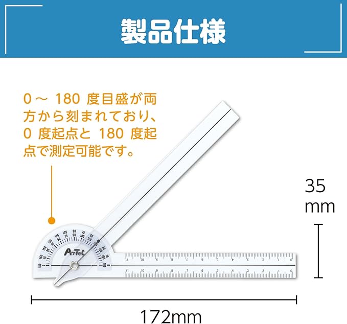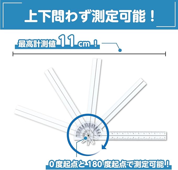 関節可動範囲の測定や、運動角度の測定などに使えます! 0度を起点とした計測と180度を起点とした計測が可能。0~180度目盛が両方から刻まれています。 角度測定目盛は白い背景で文字が見やすい! ポケットに入れても折れにくく持ち運びしやすい設計!