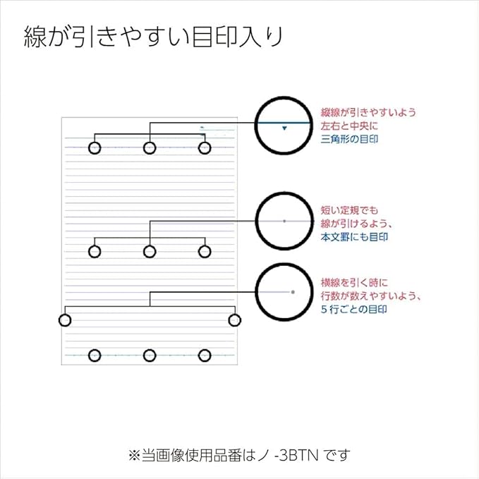 使いやすく工夫した罫内容/キャンパスノートと同じようにタテ線が正確に引けるよう、センターと左端に三角形のメモリ点を配置しました。