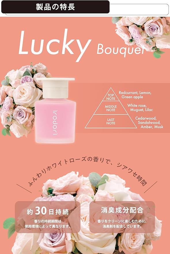 【ラッキーブーケの香り】 幸せに胸躍る瞬間をイメージしたやさしい香り 【TOP NOTE】レッドカラント、レモン、グリーンアップル 【MIDDLE NOTE】ホワイトローズ、ミュゲ、ライラック 【LAST NOTE】シダーウッド、サンダルウッド、アンバー、ムスク