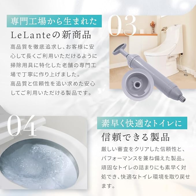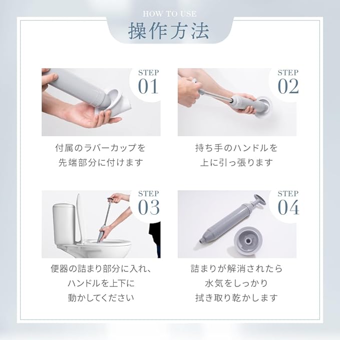 【真空式ポンプ】真空ポンプ方式で水を吸引し、排出するため、従来のすっぽん(ラバーカップ)に比べて5倍の吸引力があります。失敗が少なく、効果的に詰まりを解消します。加圧式ハンドルが付いており、押すことと引くことの2段階方式で使います。女性でも簡単に操作でき、使い方が簡単で、誰でもすぐに使い始めることができます。