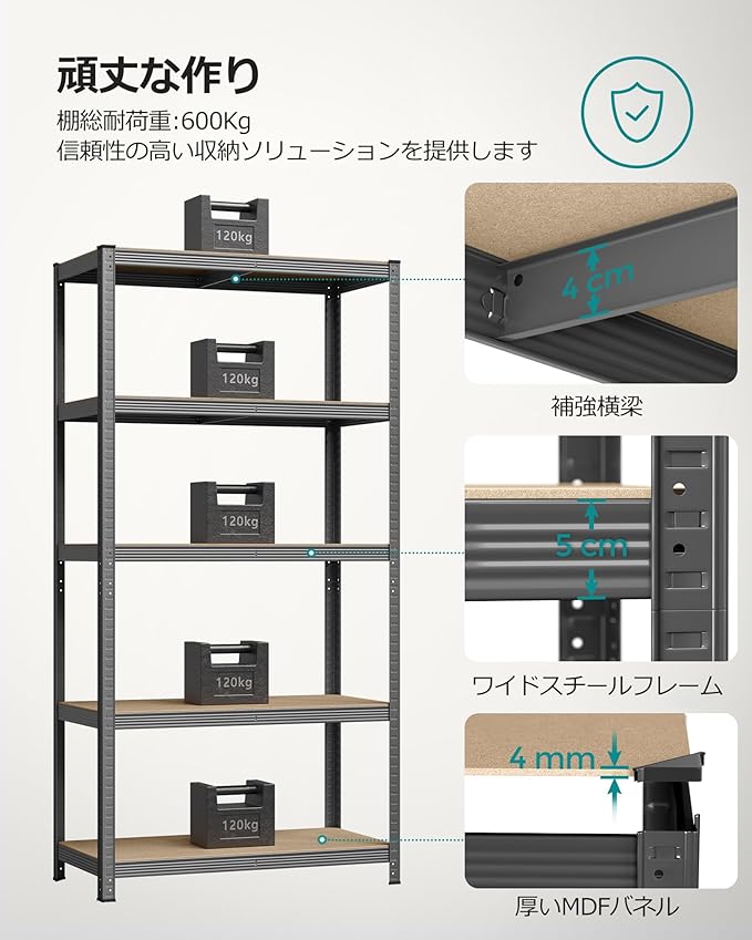 【余裕の耐荷重】良質の鋼材とMDF板で仕上げられています。棚板1枚あたりの耐荷重120㎏で、総耐荷重は600KGです。