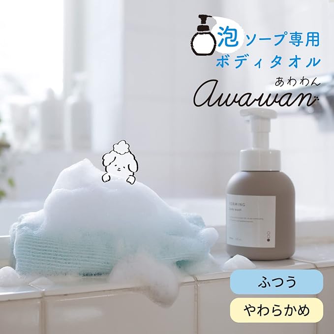 【泡ソープ専用のボディタオル】泡のボディーソープがワンプッシュで約30倍に泡立つボディタオル。ほどよい洗い心地と泡立ちを楽しめる「ふつう」タイプ。