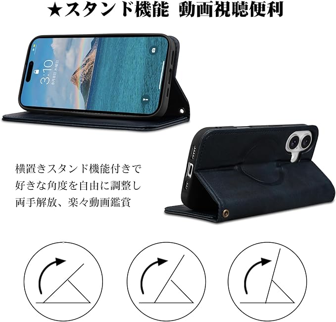 スタンド機能:このiPhone 16 plus 用 カバー手帳型はスタンド機能が付いて、横向いて斜めに立てて、お好きな角度に調整することができ、長時間の視聴でも疲れない。
