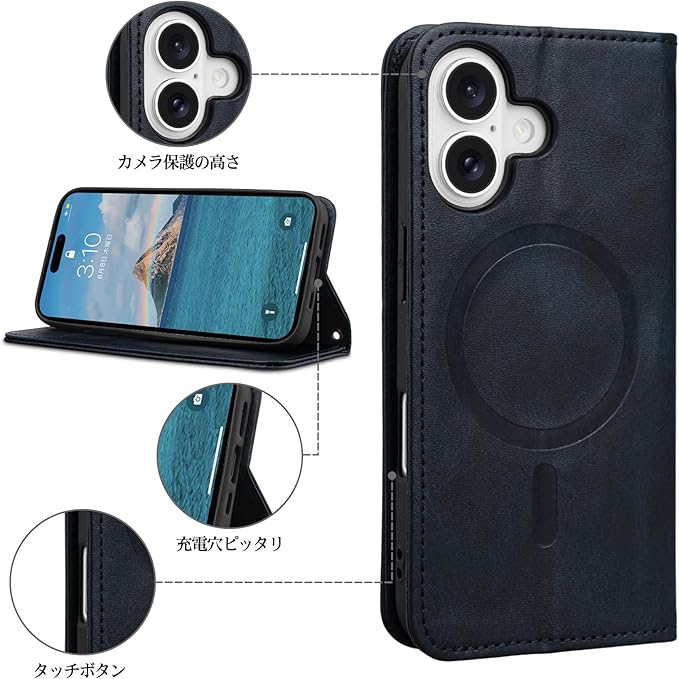 カード収納:iPhone 16 plus 用 手帳型ケースの内側にカードポケットがあり、定期券や、カード、名刺など収納可能です。日常の生活に便利です。ご注意:携帯本体に影響を及ぼす恐れがあるため、弱い内蔵マグネットを使用しています。カードを入れるとマグネットが効かない場合があります。
