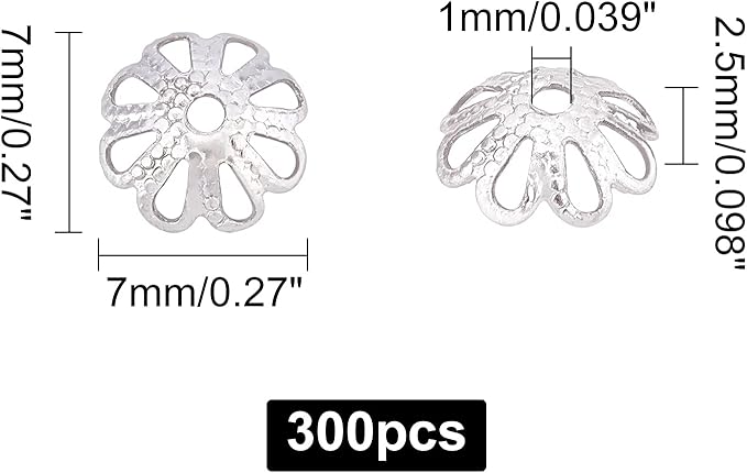 「サイズ&入り数」:ビーズキャップ:幅約7mm、長さ7mm、厚さ2.5mm。穴:1mm、300個;色:ステンレス色;パッケージの合計300個、DIYの繊細なジュエリーに十分です。想像力によりおしゃれなジュエリーがDIYできます。