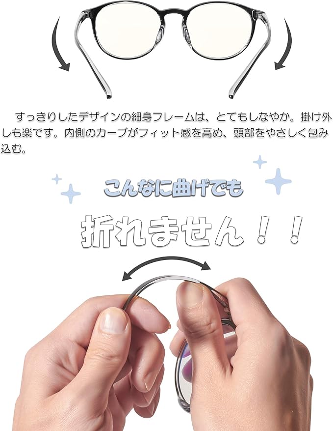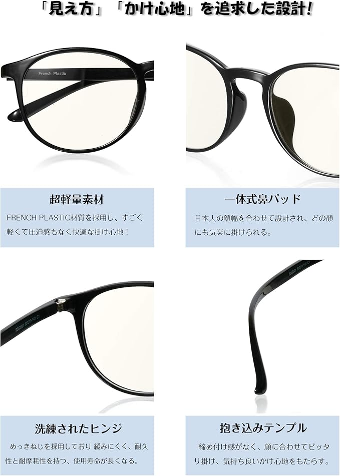 【軽い掛け心地】超軽量弾力「フランス プラスチック」材質を採用し、思ったよりすごく軽くて圧迫感もなく快適な掛け心地!毎日使ってももちろん!日本人の顔幅を合わせて設計され、どの顔にも気楽に掛けられる!