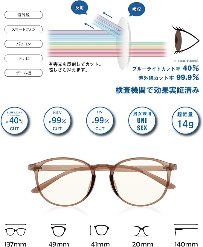【素材構成】 『フレーム素材』:超軽量弾力「FRENCH PLASTIC G850」 『鼻パッドの形状』:フレーム一体型 『レンズ』:高品質プラスチック/ブルライトカット率40%/UVカット率99%/HEVカット率90%