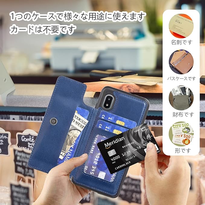 for Galaxy A21 SC-42A / Galaxy A20 SC-02M SCV46 ケース スタンド機能 ICカード収納 カード収納 背面カード収納 左と右のを反転、防水と防汚電話ホルダー、多機能財布収納付き、PUレザー、TPUソフトインナーケース (ブルー)