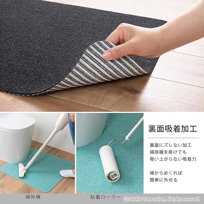 【特徴】撥水加工、カットOK、アンモニア消臭加工、洗濯機可(乾燥機不可)、吸着タイプ(掃除機を掛けても吸いあがらない吸着力)