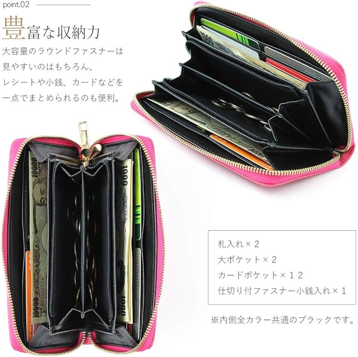 大容量のラウンドファスナーは 見やすいのはもちろん、 レシートや小銭、カードなどを 一点でまとめられるのも便利。仕切りで分けられた小銭入れは、 L字型のファスナーを採用することで 大きく開くことができます。