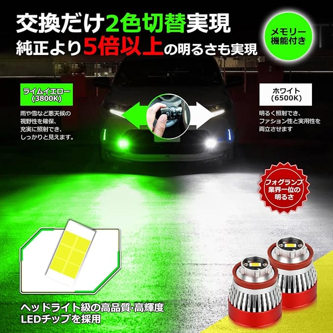 L1B フォグランプ 2色切り替え、メモリー機能付き:メモリー機能付きの2色切替可能の当該LEDフォグバルブは純正フォグランプスイッチで発光色の切り替えができるため、別途に追加スイッチの取付は不要、また、最適化されたLED発光点は純正と同じな配光設計でカットラインがしっかり出ていて、ムラのないこだわりの配光、また、純正比5倍以上の明るさが実現、車検対応可能です。