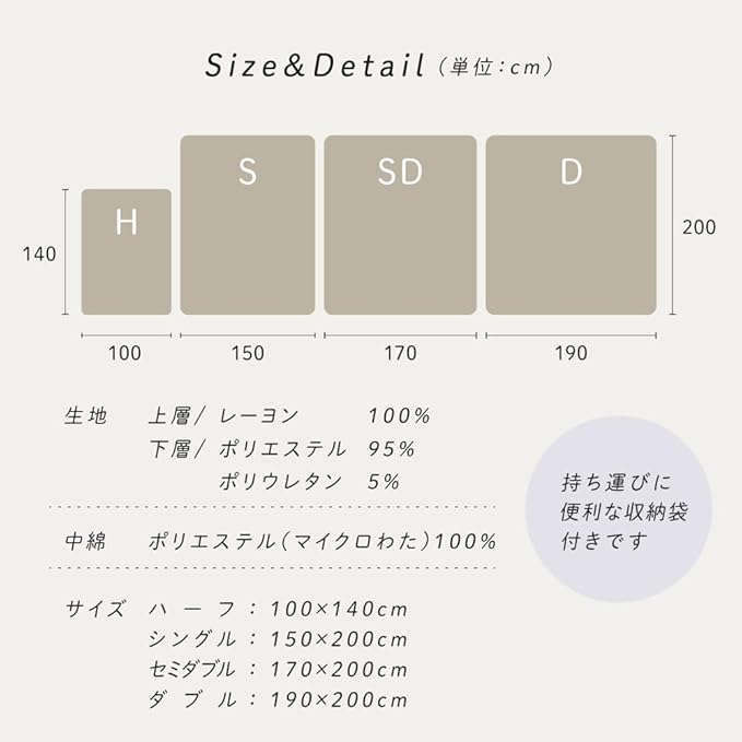 <商品サイズ>ハーフ:(約)100 140cm・シングル:(約)150 200cm・セミダブル:(約)170 200cm・ダブル:(約)190 200cm