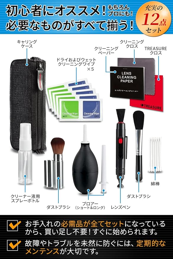 カメラクリーニングキット 12点セット レンズクリーナー 一眼レフ用 掃除用品 多くのカメラ・スマホ・パソコンに対応 送風機クリーニング ペンクリーニング クロス付き レンズクリーニングキット 一眼レフカメラ デジタルカメラ用