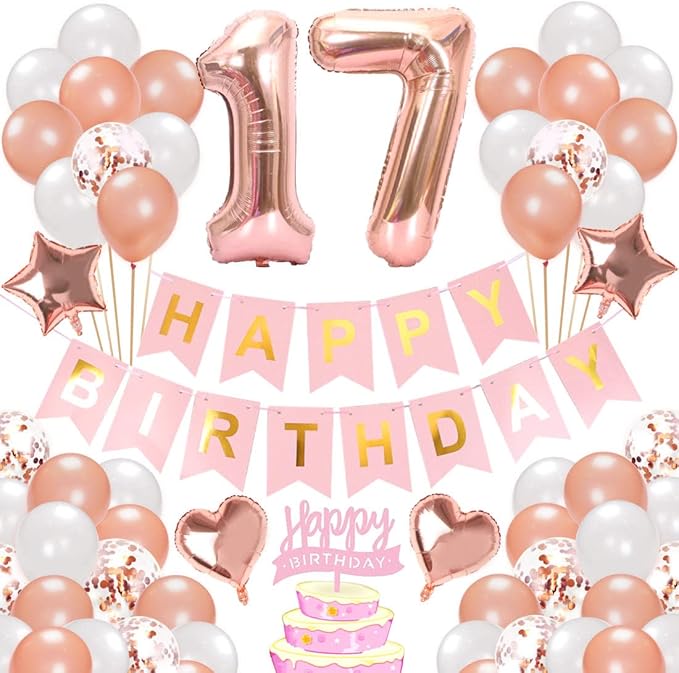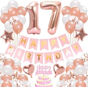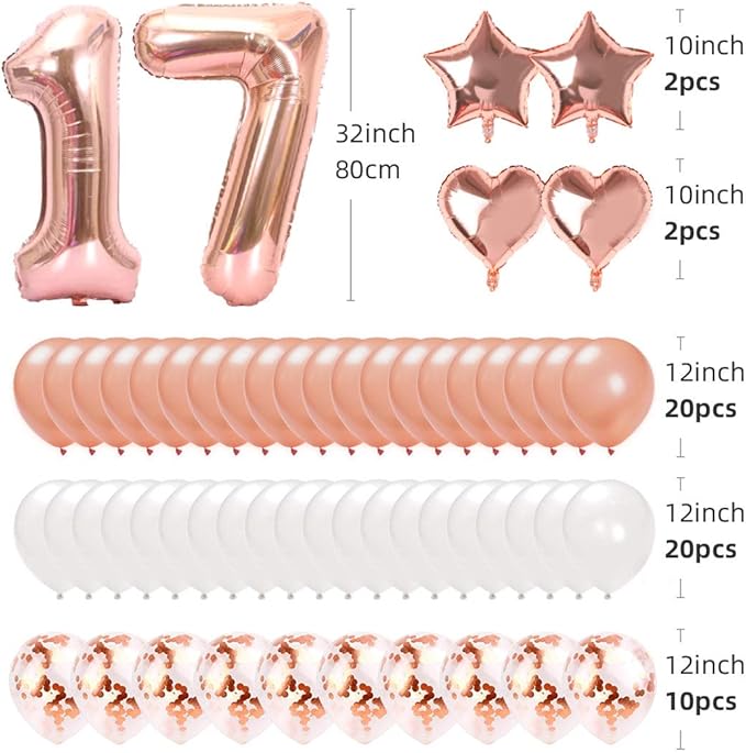 【セット内容】①「17」バルーン ②「HAPPY BIRTHDAY」ホイルバナー ③ハート風船 4 ④星風船 4 ⑤シルバー風船 12 ⑥ブルー風船 12 ⑦紙吹雪風船 12 ⑧ 空気ポンプ 1、ドット状両面テープ 2、銀色リボン 2