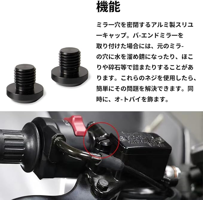 3.【機能】ミラー穴を密閉するアルミ製スクリューキャップ。バーエンドミラーを取り付けた場合には、元のミラーの穴に水を溜め錆になったり、ほこりや砕石等で詰またりすることがあります。これらのネジを使用したら、簡単にその問題を解決できます。同時に、オートバイを飾ます。
