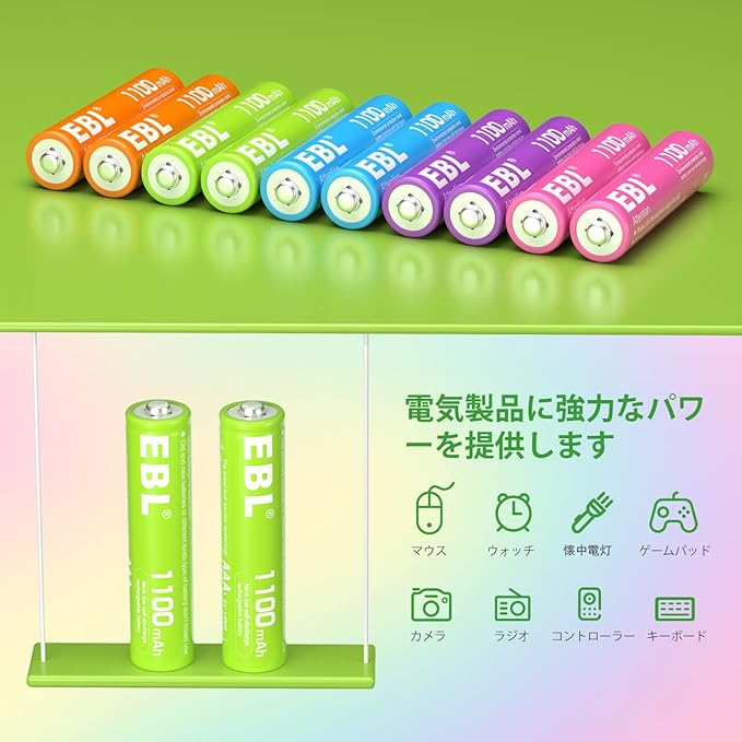 EBL 単4電池 カラフル充電式ニッケル水素1100mAh 10本入り ケース付き 使い分け簡単 繰り返し AAA 玩具フェイスシェイバー 体重計 マウス 電動歯ブラシ 電子辞書 ミニ四駆などの設備に最適 単四 防災用