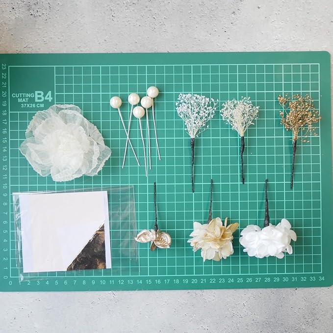♦︎パーツ詳細♦︎オーガンジーフラワー1パーツ、ドライフラワー6パーツ、パールピック、ブロンズ箔