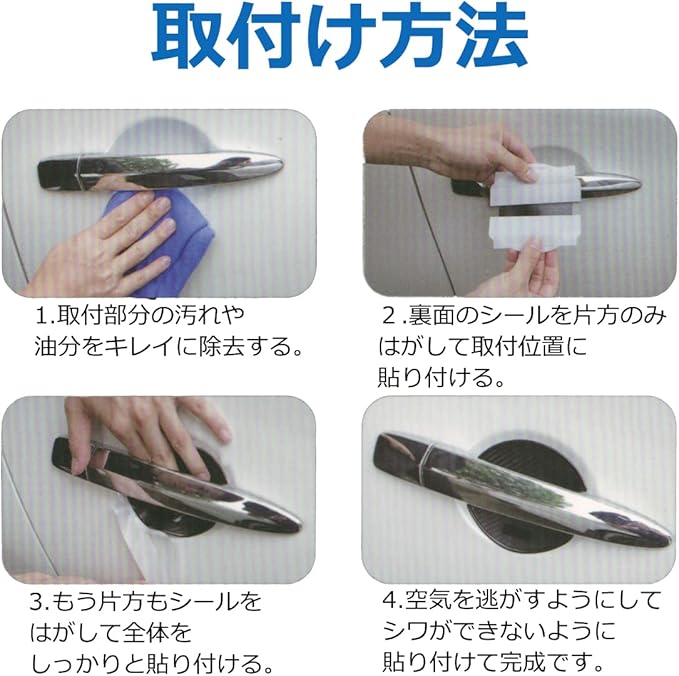 自動車のドアハンドル部分をキズからガードしてくれるプロテクターの4枚セットです。