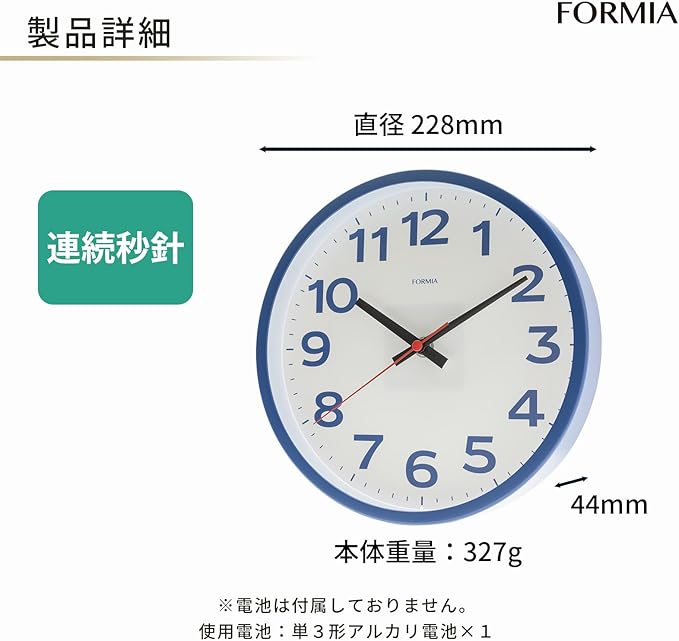 Formia(フォルミア) 掛け時計 マリンスタイル 直径22.8cm 見やすい文字盤 トラディショナルデザイン シンプル 連続秒針 ネイビーブルー HWC-012W-NB