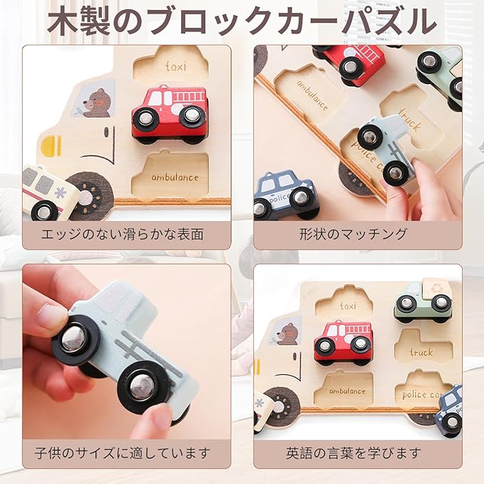 [木製車モデル]木製の車のパズルモデルのセット。かわいいデザイン、コンパクトカー、木材素材。小さな赤ちゃんの手でさえ、車のサイズは簡単に保持でき、プレイは楽しくなります。