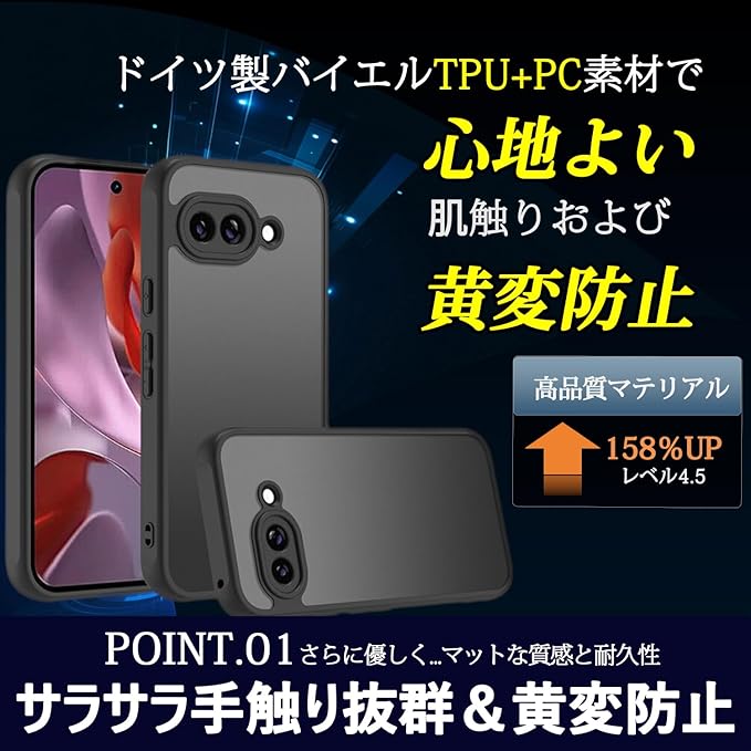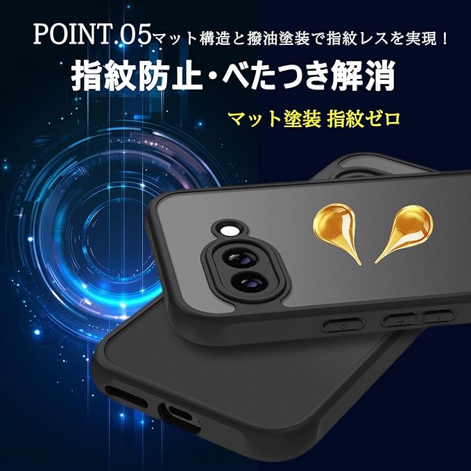 【半透明美学・マットな仕上げ】マット感半透明デザインにより、Google Pixel 9a の本来の美しさをほのかに引き立てます。マットな質感で羽毛のような触り心地を楽しむことができ、快適で薄いグリップ感を提供します。また、耐久性と耐摩耗性にも優れています。表面には指紋防止ナノオコーティングを施しており、指紋つく心配はありません、汚れを防ぐ効果を高めました。高級感と神秘感が溢れ、かっこいいロゴが見えます、