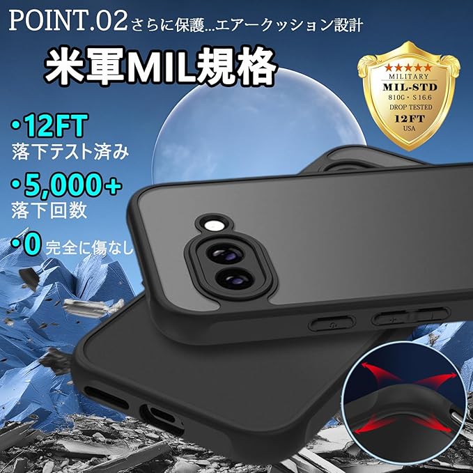 【米軍MIL規格・ 耐衝撃】米軍MIL-STD採用品規格で、エアクッション技術を採用した四隅のデザインは、強力な全周保護システムを提供し、四隅のエアクッションが損傷を吸収し、あらゆる方向からGoogle Pixel 9aを保護します、より一層な安心感を与えられます、高い耐衝撃性を誇り、日常生活において様々な損傷に避ける。スクリーンやレンズの破損リスクを低減、高額の修理費用を節約、Google Pixel 9aを全方位からしっかりと守ります。