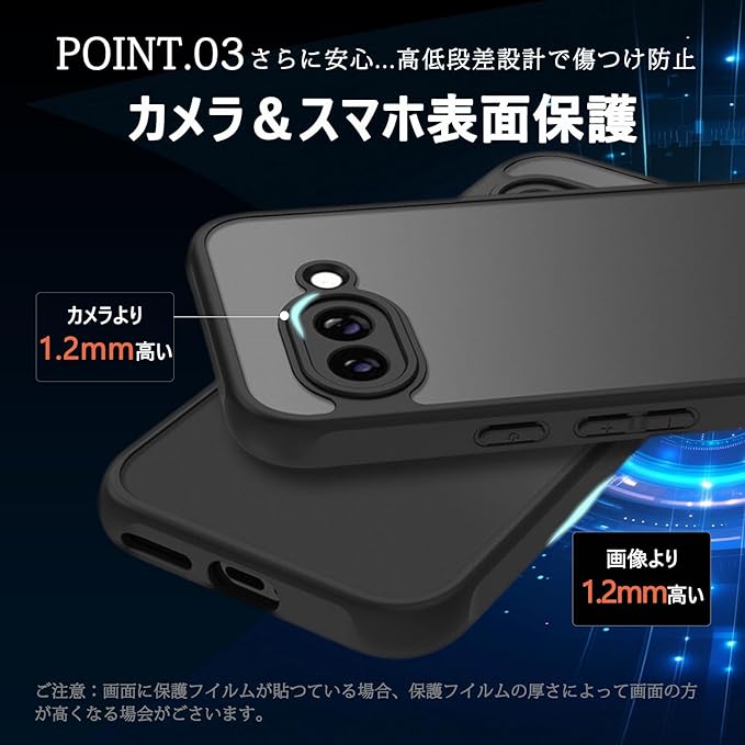 【画面とレンズ保護機能】液晶画面より1.2mm高め、併用のガラスフィルムまでも保護できます。背面側はカメラレンズより1.2mm高め、机などの平面に置いても傷付く心配はありません。更に、Google Pixel 9a ケースの背面までも傷から保護でき、ガラスフィルムとの干渉を避けます。日常の様々な傷から保護します。スクリーンやレンズの損傷リスクを低減します。